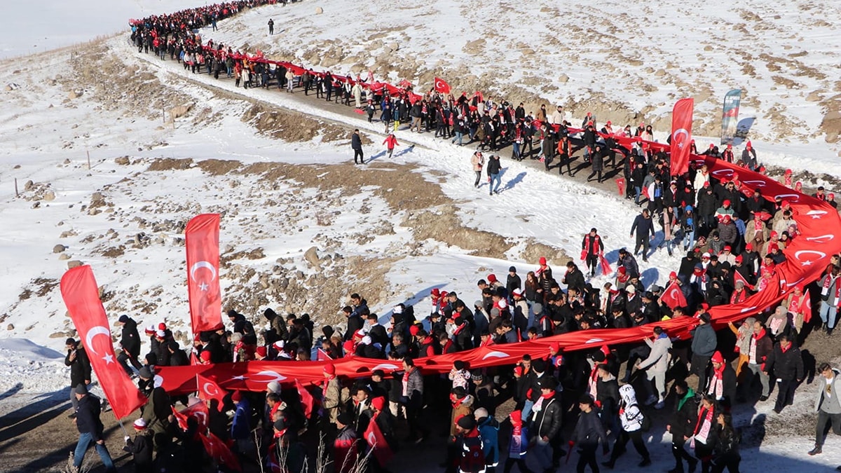 Sarıkamış Harekatı’nın 109’uncu yıl dönümü nedeniyle Kars’ta ‘Türkiye Şehitleriyle Yürüyor’ etkinliği yapıldı. Sabah saatlerinde toplanma merkezinde bir araya gelen vatandaşlar, ellerinde bayraklarla yürüyüş için hazırlandı.