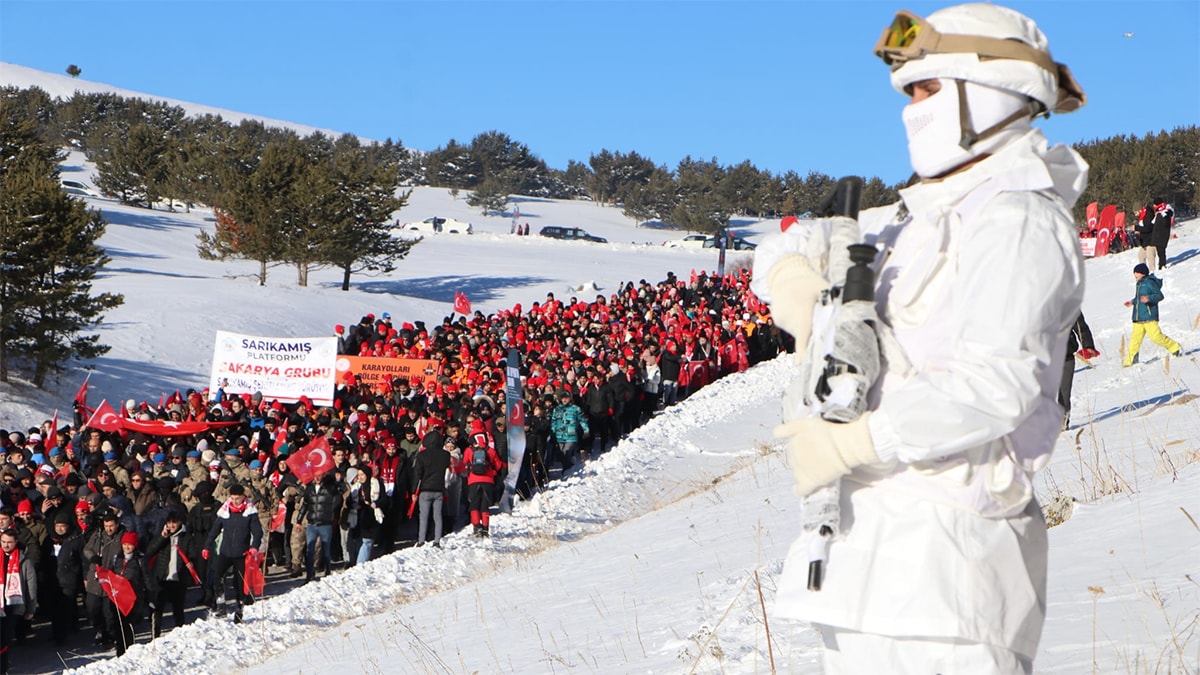 Termometrelerin eksi 10 dereceyi gösterdiği Sarıkamış’ta yürüyüşe katılanlara Kars Emniyet Müdürlüğü Terörle Mücadele Şube Müdürlüğü, Sarıkamış Belediyesi ve Kızılay ekipleri, sıcak çorba ikramında bulundu. Kars Müftüsü Hamza Bayram’ın ettiği duanın ardından Gençlik ve Spor Bakanı Osman Aşkın Bak, Aile ve Sosyal Hizmetler Bakanı Mahinur Özdemir Göktaş, Vali Ziya Polat, AK Parti Milletvekili Adem Çalkın, protokol ile çok sayıda vatandaşın katıldığı yürüyüş, komando andıyla başladı. Yürüyüşte gençler, Türkiye Cumhuriyeti’nin 100’üncü yılı nedeniyle 100 metre uzunluğunda Türk bayrağı taşıdı.