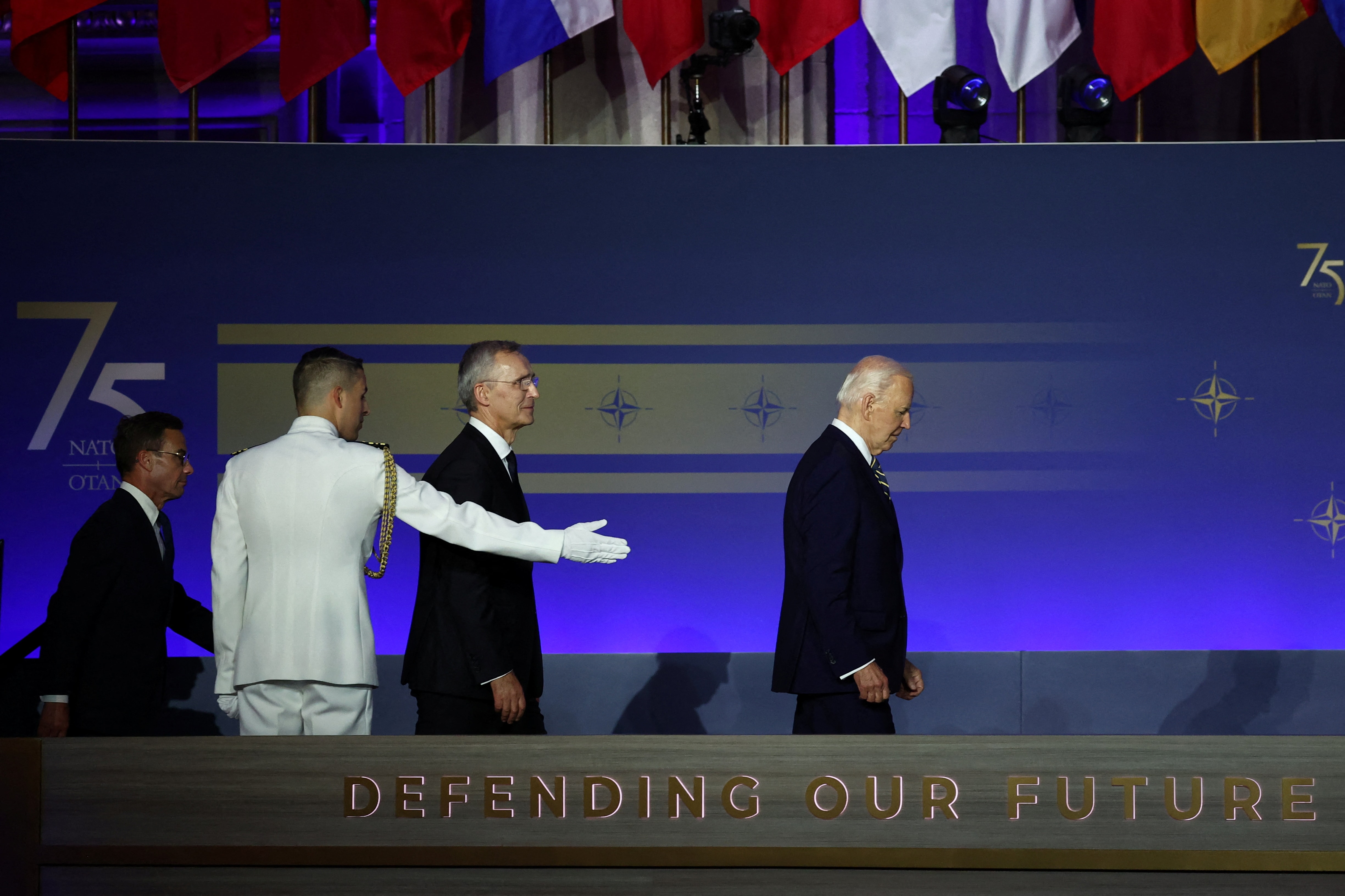 Tören, 1949 yılında “Kuzey Atlantik Anlaşması”nın 12 ülke tarafından imzalanarak NATO’nun kurulduğu Washington’daki “Andrew W. Mellon Oditoryumu”nda gerçekleştirildi.