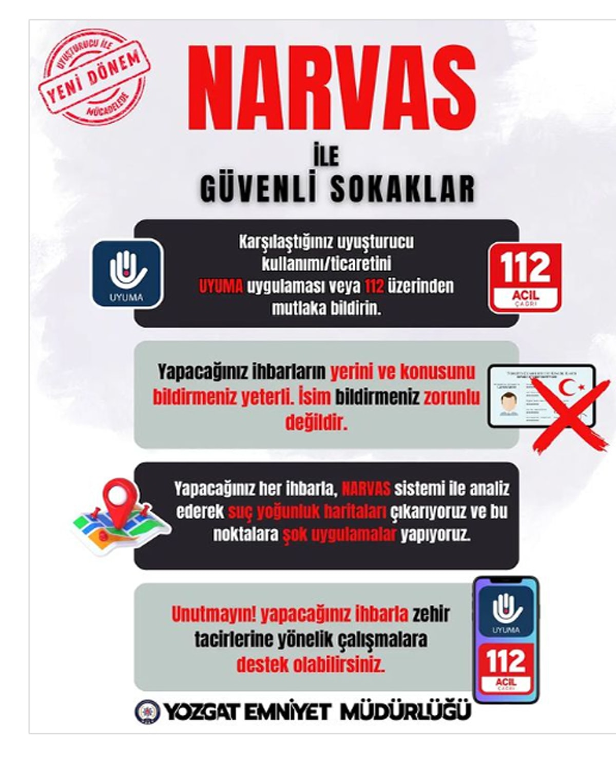 NARVAS (Narkotik Vaka Analiz Sistemi), UYUMA ve 112 Acil Çağrı Merkezi’ne yapılan narkotik ihbarlarının analiz edilmesine, analize dayalı yoğunluk haritalarının oluşturulmasına, suçluların tespiti ve yakalanmasına, yer ve zaman odaklı mücadele planları ve stratejilerinin hazırlanmasına olanak sağlayan bir yazılım programı. Biz, NARVAS ile bütün ihbarları doğru kabul ediyor, işlem başlatıyoruz. İhbarlar yoğun olarak nerelerden yapılıyorsa, kolluk kuvvetlerimiz o bölgede yoğunlaşıyor. Hangi saatlerde, hangi sokak başında, hangi noktada uyuşturucu satışı yapılıyor, en ücra yerleri dahi tespit edip, suçluları yakalıyoruz. Proje ile suç haritaları hazırlıyoruz, riskli bölgeleri tespit ediyoruz ve “Narko Alan Bölgeleri” oluşturuyoruz. Biz topyekun bir mücadele istiyoruz. Çünkü halkımızın ve annelerin yardımı bizim için önemli. Ne kadar erken öğrenirsek o kadar çabuk müdahale edebiliriz. 1 dakika erken öğrenmek bile bizim için çok değerli. O bir dakikalık erken zaman 1 çocuğumuzu uyuşturucudan kurtaracaktır. Bizim mücadelemizi diğer ülkelerin yapamadığını da söylemek isterim. Uyuşturucuya teslim olmuş durumdalar. Biz ülke olarak uyuşturucu ile çok ciddi bir mücadele veriyoruz.